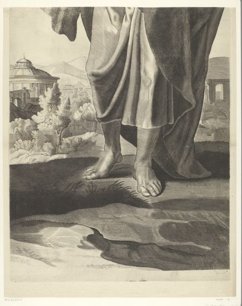 Editor: Here we have a detail from Francesco Botticini's "Assumption of the Virgin," painted around 1476 using oil paints. The detail focuses on one of the kneeling figures, set against a sweeping landscape. It has an interesting stillness about it, especially with that clear skyline. How might we interpret its cultural relevance? Curator: Well, placing this within the social history of the time, one sees the rising merchant class in Florence, becoming key patrons of art. How do you think this plays into the artist’s depiction of the city within a religious scene? Is it merely background? Editor: I guess it’s tempting to think of it only as background, but that feels reductive, given its scale. It's very prominent. The buildings are all in sharp detail. Curator: Exactly! Its prominence highlights a developing civic pride closely intertwined with religious identity. Think about who was commissioning art like this, and where it would have been displayed. Often, it’s chapels of wealthy families who were actively curating a relationship between themselves, their city and the divine, as a visible projection of social power and personal piety. Does knowing this shift your interpretation? Editor: It certainly complicates my initial read. What I saw as serene feels much more active and intentional now. It’s less about a universal Assumption and more about a localized expression of faith intertwined with earthly power. Curator: Precisely. It underscores the powerful role art plays in shaping public perception and reinforcing social hierarchies, especially in this period where new wealth reshaped social mobility and public image. Editor: This has reshaped my understanding of Renaissance art, demonstrating how closely entwined it was with the specific sociopolitical circumstances. Curator: Indeed. It challenges us to consider the multifaceted functions art performs beyond its aesthetic appeal.