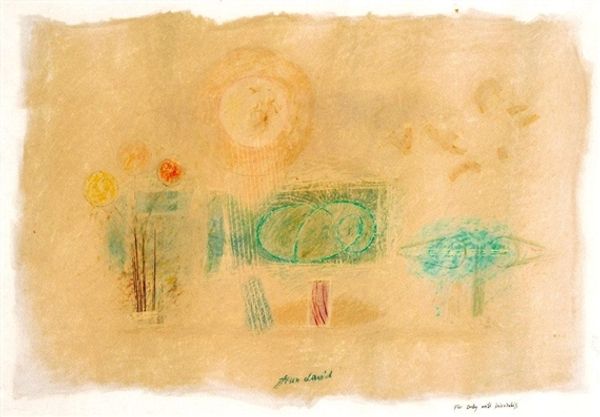 Editor: Here we have an untitled watercolor on paper, possibly a plein-air work, by Jean David. It strikes me as incredibly subtle; a fleeting impression of a landscape, captured with minimal strokes. How do you interpret this work? Curator: Indeed, its beauty lies in its delicate execution. The artist uses what appears to be watercolor and possibly impasto techniques, the layered applications revealing both depth and a certain transience. It brings to mind the cyclical nature of memory – how fragments surface, coalesce, then dissipate again, colored by individual experience. The dashes of colour read like encoded messages. What visual echoes or symbols do you find resonating within the image? Editor: I notice the vertical marks, maybe suggesting stems of plants. And those clustered brown and green marks evoke perhaps decaying leaves, which definitely points towards your thoughts on memory and loss. Curator: Exactly. Landscape painting has historically acted as a canvas for projecting psychological states. Notice how the brighter, sharper pigments contrast with the muted background, potentially creating a conversation between vitality and decay, present and past. Do you find those juxtapositions within other symbols or images here? Editor: The little patches of yellow; they could be fading sunlight. Curator: And in this context, light carries so much symbolic weight; the light of consciousness, revelation, or, inevitably, fading into the unconscious once more. Understanding the role of nature within both personal and collective memory allows us to see how images such as this work provide meaning. What new ideas have you formed by considering its iconography? Editor: It made me consider the impact of minimalism and subtlety on making art meaningful and impactful in portraying nature and memory. Curator: Indeed. Through symbolic landscapes, Jean David subtly yet powerfully opens a window onto how perception shapes memory and understanding of the world.
