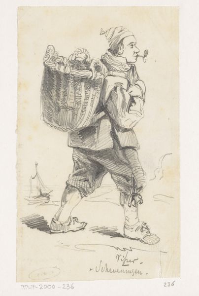 Curator: This delicate pencil drawing, titled "Jonge reizende koopman," or "Young Traveling Merchant," is by Mary Hector Rupert Cantineau, and it dates from before 1909. What strikes you most about it? Editor: It has a melancholic air. He seems weighed down, not just by his wares, but by… something unspoken. Is that just me? Curator: Not at all. The realism gives him a vulnerability, doesn't it? He is burdened and maybe doesn't quite know where he is going. And notice how the artist uses the pencil – light, feathery strokes in places, much darker and more defined in others to create shadow and volume. The detail in the young man’s face gives his expression all the more impact. Editor: Absolutely, the line work communicates the subject’s mood well. Looking closer, I'm drawn to the contrast between the meticulous detail on the merchant's face and clothes compared to the minimal treatment of the background. Curator: Interesting observation! It pushes our focus directly to him and his tools of trade, his pack and his basket—essential items in his itinerant life. It makes me wonder what these implied market journeys would really have been like. What sort of pressures and demands would he be under. Editor: That's right. What is he selling? Where does he source them from? What conditions does he have to travel through, who sets the price and profit that can be made from it? These drawings bring into focus those essential elements of making, selling and distribution. And even of the paper itself. The chain of suppliers needed for that merchant to function, now functions too with the artist. Curator: Yes, like a microcosm of larger systems, eh? Thanks, that shifts my perception. There’s a silent story embedded here—his labor, the materiality of his goods, and perhaps, a shared understanding between artist and subject about the weight of daily existence. Editor: Precisely. The very act of creating this portrait connects us to that world, where every stroke of the pencil holds a weight of its own. I think it prompts interesting discussions about the business of living at this moment.