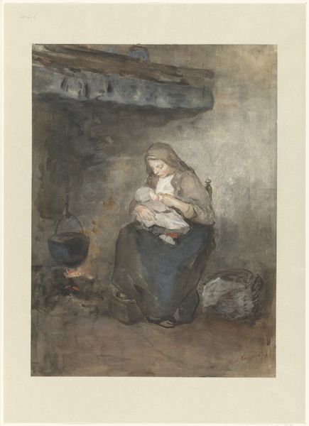 Editor: This is "Two Children in a Peasant Interior" by Albert Neuhuys, painted in 1879. It’s a watercolor painting, currently hanging in the Rijksmuseum. It's remarkable how this rather muted color palette creates a feeling of quiet domesticity and maybe even a touch of melancholy. What symbolic language speaks to you in this piece? Curator: The enduring symbol here for me resides in the very *domesticity* you mention. Think of the hearth, literally the fireplace depicted – its open darkness hints at untold stories. What objects do you notice positioned there, above it? Editor: I see what look like Delftware plates. Curator: Exactly! Those plates are more than mere decoration. They act as cultural signifiers – symbols of cleanliness, order, and perhaps even aspirations to a higher social standing displayed within this rustic environment. How do they contrast against the humble scene below? Editor: I guess they feel a little out of place, or at least aspirational compared to the worn interior and the simple lives depicted. The light catches them, almost as beacons. Curator: Precisely. And consider the children. One plays with what seems to be a simple, hand-carved toy. The other sits passively. These children embody innocence, but also perhaps the constraints of their social position. Do you find symbolism in the tools stored on the walls? Editor: They underscore the working environment, like a visual representation of their daily lives and inevitable future work. It is amazing to consider all these symbolic relationships between these objects. Curator: Indeed! It highlights how visual symbols tell stories of labor, home life, and unspoken aspirations across generations. Ultimately, art provides a link that allows for cultural memory and continuity through images that carry meaning far beyond their immediate depiction. Editor: That makes me consider the objects and artworks in my own environment now, and the messages they are sending! Thank you!