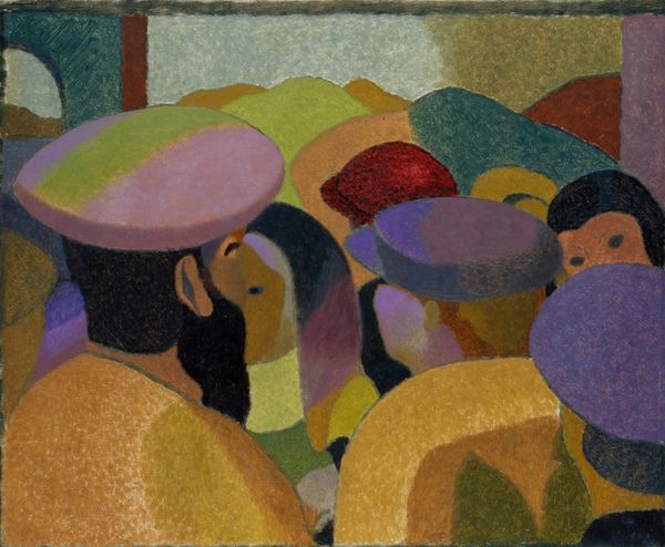 Curator: Alright, so before us, we have August Macke's "Tightrope Walker," dating back to 1914, a canvas where he captured a fleeting circus scene, now residing here in the Kunstmuseum Bonn. Editor: It's disorienting in the best way! All these lines converging and pulling my eye upward to that little figure—who almost disappears against the chaos. A sense of vertigo mixed with vibrant colors… fascinating. Curator: Absolutely. Macke was a master of imbuing everyday scenes with emotional depth, channeling the anxieties and thrills of modern urban life through expressionistic gestures. Notice the tilted perspective, which forces the viewer into the thick of the crowd. It's a sea of spectators, isn't it? Editor: More than spectators, really, archetypes. Each individual blurs into this collective entity – the crowd itself becoming the main symbolic figure. The tightrope walker is a stark contrast, isolated, balanced precariously. Classic hero's journey kind of vibe, no? The bright palette seems intentionally theatrical too. A tightrope walker could signify vulnerability. Curator: Indeed. Given the era – just before the outbreak of World War I – some interpret the tightrope walker as a symbol of precariousness and instability facing Europe. Perhaps this is a metaphor for the artist’s precarious place as a modernist visionary. Editor: Interesting... but I think he wants to convey how close modern civilization is to catastrophe and to see the tightrope walker's performance under such circumstances. The way Macke frames the cityscape beyond – almost abstracted into geometric shapes – evokes both modernity and a certain fragmented reality. And I feel the faces of audience look like future victims, do not look enthusiastic for this performance, it gives some clues about the anxiety of that time... Curator: An apt interpretation. It encapsulates that pre-war tension perfectly. What fascinates me most is Macke’s deftness in balancing bold, Fauvist color with an almost childlike simplicity of form. The emotion is right on the surface. Editor: Exactly. Looking closer at his geometric shapes, you can glimpse into your own anxiety about something you do not know! The clown makes the danger clear and that creates its magic. Thanks to the symbolic world in it you keep dreaming about the reasons behind Macke´s vision. Curator: Thank you for unveiling your impressions.