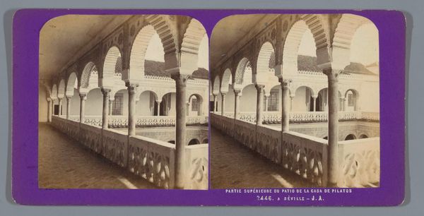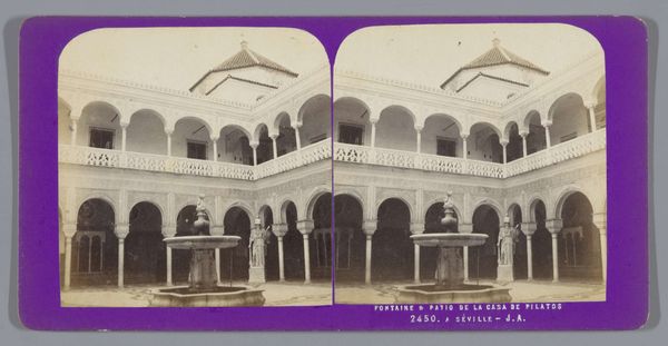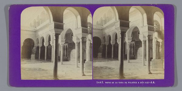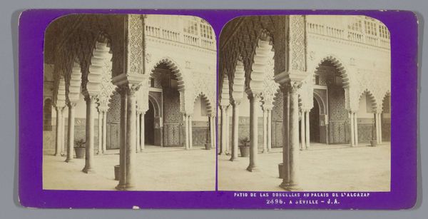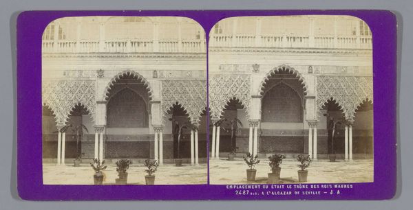 Curator: Immediately, I'm struck by the geometric perfection, the balanced rhythm of light and shadow. Editor: We’re looking at a photograph by Jean Andrieu, taken between 1862 and 1876. It captures a view of the Patio de las Doncellas and the gate of the Salón de Embajadores in the Alcázar of Seville. It’s interesting how the technology of photography, then relatively new, documented these kinds of built spaces. The question I find foremost here is how widely available were these photographic records. Curator: Absolutely, and notice how the interplay of arches creates a mesmerizing effect, drawing the eye deeper into the architectural space. It almost has a theatrical effect with the plant decoration set out. Editor: I find the choice of documenting an area devoid of people peculiar. Did Andrieu wait until there was no one there? Curator: Perhaps, or consider that people from this time may be unaccustomed to photography. Perhaps it also has to do with the longer exposure times associated with this new medium. Focusing instead on the materials employed - stucco, tile, and carved wood - as markers of power and status allows a lens onto a consumer culture in nineteenth-century Spain. Editor: I concede there is great intent in the composition here: a shallow depth of field, a calculated placement of architectural components. Consider how the repeating patterns within the arches create an echo effect, further accentuating the depth of the space. Editor: Do you see the different states of the brick or rock components? You know I am interested in who constructed the space; it suggests something about the labor behind this site. We see the mark of hand-made decorative labor. What kind of market sustained these skilled laborers at that time? Curator: Very insightful. The photographer perhaps wants the architectural detail to overwhelm everything and is emphasizing a sense of timelessness. This photographic style could appeal to elite tastes and imaginations regarding the past. Editor: That said, it serves a unique purpose for contemporary viewers: revealing clues about societal structures and economic realities, both hidden within and illuminated by art objects. Curator: Indeed, reflecting on these complexities broadens our comprehension of cultural narratives interwoven within these intricate settings.