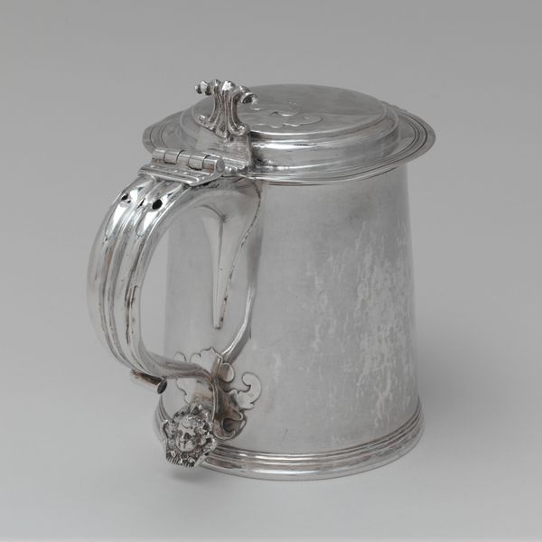 Curator: Let's explore this Tankard, dating from 1700 to 1715 and currently held at the Metropolitan Museum of Art. It’s crafted from metal, reflecting the skilled craftsmanship of the period. Editor: My immediate impression is one of understated elegance. The smooth, silvery surface and clean lines exude a quiet sophistication. It feels both functional and ceremonial. Curator: Function and status were indeed closely linked. This type of tankard, particularly when made of silver, spoke volumes about the owner’s wealth and position within the community. Drinking vessels like this were displayed and used during social gatherings, acting as symbols of hospitality and affluence. Editor: Thinking about the broader social context, I wonder about the enslaved laborers who were likely involved in mining the metals used to create it. It’s vital to acknowledge the labor and social hierarchies embedded within its creation, to recognize this is not just a beautiful object. Curator: Absolutely, that's a crucial consideration. The demand for precious metals fueled colonial exploitation, a harsh reality behind such luxury items. Moreover, consider the regulations surrounding alcohol at the time; its consumption would be governed by specific social customs, often reinforcing power dynamics within households and communities. Editor: The very act of toasting and sharing from such a vessel becomes a performative act of inclusion or exclusion, subtly enforcing social boundaries. Even something as seemingly straightforward as a drinking vessel carries loaded symbolism related to identity and social positioning. Curator: Exactly, its significance extended far beyond mere utility. It's a tangible link to a past defined by strict social codes and global power structures. And how those power structures manifest today, with issues such as accessibility and wealth distribution reflected in how such objects are seen and interpreted. Editor: Revisiting the visual qualities for a moment: seeing those elaborate motifs adorning the handle and lid, almost gothic in appearance, gives me chills. Knowing their production rested on human suffering taints their beauty. But recognizing the historical roots to their form allows us to approach the object through a critical lens. Curator: Precisely, analyzing such an object means holding beauty and social responsibility in productive tension. Editor: This object certainly offers layers of context to contemplate. Curator: Indeed, it compels us to re-examine both the artistry and the complex socio-political backdrop.