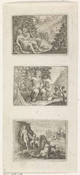 Editor: We're looking at "Daughters of Minyas Transformed into Bats / Scene from Mythology / Bacchus Chasing Erigone," an etching made sometime between 1680 and 1800 by an artist known only as Monogrammist MP. It's a baroque print showing three different scenes from mythology, rendered with fine lines and delicate detail. The overall mood is quite dramatic. What draws your eye, and how do you interpret this work? Curator: What captures my attention first, always, is that potent mix of the sacred and the profane, isn't it? The Baroque was obsessed with just that – that dance between earthly desire and divine retribution. These little narratives, nestled one atop another like stacked dreams, feel almost…operatic. Do you notice how each scene hints at a deeper story? The Daughters of Minyas, weaving tales that dared to defy the god Bacchus, only to be transformed into creatures of the night. The scene below hints at drunkeness, which leads to other unfortunate circumstances, culminating in death. Finally Bacchus comes for Erigone who asks to die. It’s a potent little collection, wouldn’t you agree? Editor: Definitely. The bat transformation is striking and terrifying in that top panel. It makes you think about the consequences of defying the gods! What is it about mythology that inspired so many artists through the centuries? Curator: Well, aren’t myths just vessels for the eternal human drama, dressed up in togas and laurel wreaths? Think about it: love, loss, power, betrayal – these themes are as relevant today as they were millennia ago. And Baroque artists, bless their dramatic hearts, knew just how to dial up the emotional intensity. So, are you catching that vibe, now? Editor: Absolutely. I appreciate your insights; it is all food for thought. I never considered the personal stories, nor the consequences within them. Curator: See art isn’t just what we look AT, but also how we choose to interpret it in a contemporary world. The personal narrative. Always present, always available for analysis.
