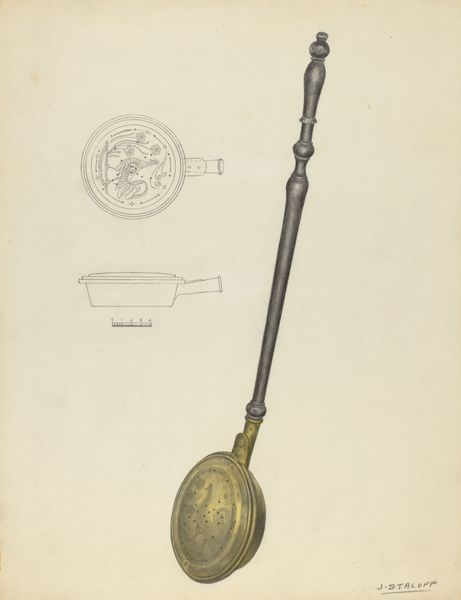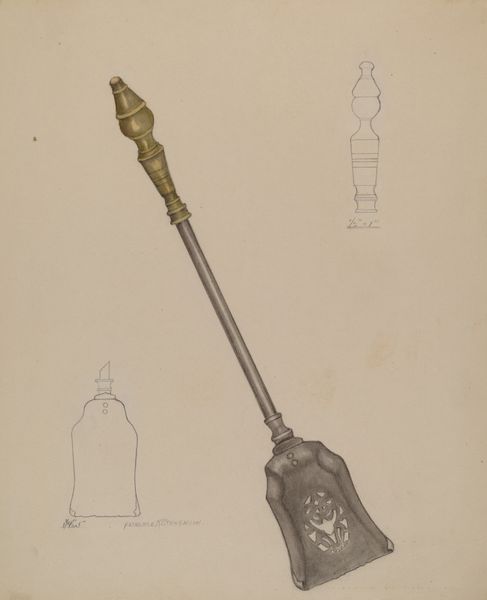 Marie Famularo made this drawing of a fire shovel with graphite and colored pencil sometime in the twentieth century, and it's fascinating to see something so everyday given such careful attention. I find myself drawn to the way the light is rendered on the golden handle, there's a real sense of volume and form, and then in contrast the shovel head is presented in multiple views; a diagrammatic line drawing sits next to a shaded, three-quarter view. The whole composition has the feeling of an instruction manual, but for what? The artist's hand is present, but concealed by the nature of the work; we can't see the gesture, but rather the result. There's a dialogue here with artists like Vija Celmins, who also examined everyday objects with a forensic gaze, but here the slight awkwardness of the drawing gives the object a touching quality, elevating it beyond the purely functional. Art isn't just about what we see, but how we see, and Famularo offers us a chance to reconsider the beauty in the mundane.