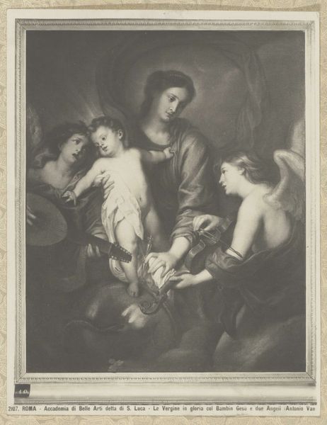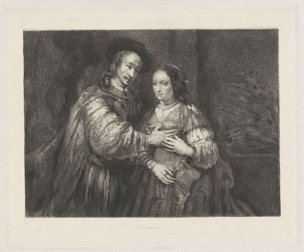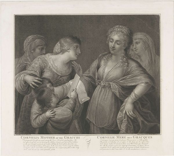 Editor: Here we have Wallerant Vaillant's "The Artist's Family". It's a monochrome print, and I am struck by the composition, how the figures are arranged. What do you see in its visual structure? Curator: Note the strong diagonals created by the gazes and gestures, which leads the eye across the picture plane. The subtle gradation of tones, achieved through mezzotint, creates a unified visual field. How does the artist manage to give depth to the work? Editor: Through the strategic use of light and shadow, the artist creates a sense of three-dimensionality. I initially missed that effect! Curator: Exactly! The balance between light and dark areas provides visual interest and defines the forms. I'd say it is a successful study of light, tone, and texture.