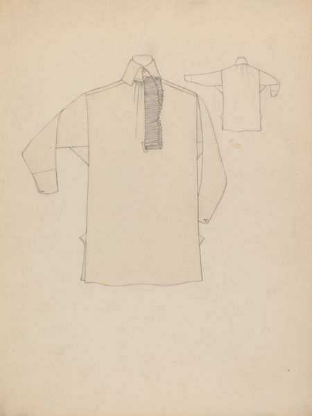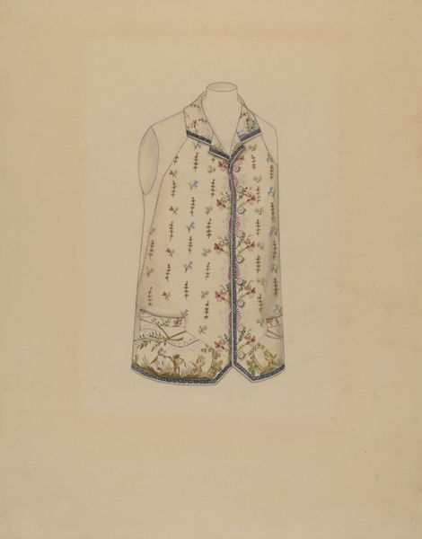 Editor: Here we have Dorothy Gernon’s "Waistcoat," made around 1936 using mixed media on paper. The waistcoat’s floral pattern feels delicate against the aged paper, almost like a preserved memory. What do you see in this piece, something beyond the visual representation? Curator: It whispers of forgotten gardens and the ghost of dandyism, doesn't it? I wonder, what's more intriguing—the waistcoat itself, a fleeting fashion statement, or the artist's choice to immortalize it in this tender sketch? The faded palette, the delicate floral pattern, speaks of a gentler era, almost as if Gernon were trying to capture a dream. It evokes the fleeting nature of beauty, doesn't it? Perhaps it's about time’s relentless passage or perhaps the artist loved the juxtaposition of this romantic waistcoat against modern tailoring. What do you think about its style? Editor: That’s lovely, thinking about it as a way to stop time. The waistcoat is very geometric. It reminds me of the neat casual fashion of my grandpa, I mean the past. The colour palatte evokes the era too. Curator: Absolutely! Gernon captures that precise moment when formality met comfort. I imagine someone perhaps like a jazz musician wearing something like this, expressing themself in art and dress, defying categorization. Do you imagine the waistcoat being for special occasions? A fancy vest at a jazz gig perhaps? Editor: It feels special occasion-y, right? Definitely fancier than what I wear to my lectures. Thinking about its context opens up whole stories… Curator: Exactly! And maybe, just maybe, that's the point. Art invites us to finish the narrative, filling in the blanks with our own imagination. Editor: I love that - we’re not just looking, we are participating. Thanks, this made me look at sketching, memory, and storytelling with clothing so differently. Curator: The pleasure's all mine. It's always about seeing beyond the surface, isn't it? That is what art is all about.