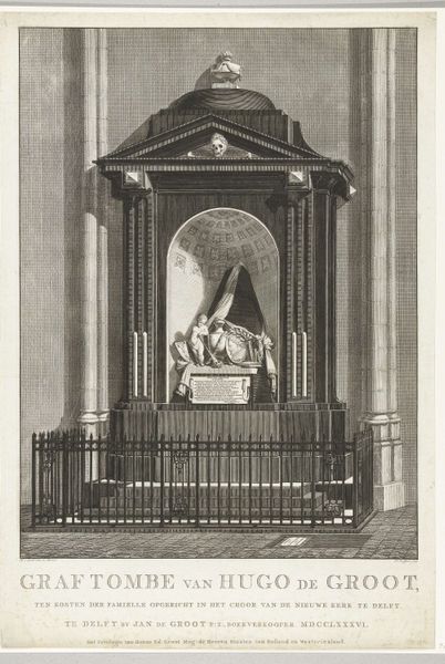 Editor: Here we have Cornelis Brantsma's "Grafmonument," created sometime between 1822 and 1847. It's an engraving, showcasing intricate linework. What strikes me is the stark, almost official feel. It's clearly intended to commemorate someone of importance. What do you see in this piece from your perspective? Curator: This engraving gives us a window into the culture of memorialization during that period. Notice how the monument is designed not just for remembrance, but to project an image of power and respectability. It isn’t merely about grief; it’s about legacy management. How does the visual language – the choice of the bust within an archway, the heraldic symbols – reinforce societal hierarchies of the time? Editor: It’s interesting you say that. It's like the monument is performing status. Does the medium of engraving, in particular, contribute to that sense of officialdom? Curator: Absolutely. Engravings, unlike unique paintings, allowed for reproduction and dissemination. This means the image of the deceased, and the values they represented, could be spread widely, influencing public memory and potentially reinforcing certain social and political ideologies. Who had access to these prints, and how might that have affected their perception? Editor: So, it’s not just about remembering an individual but also about shaping public opinion. Curator: Precisely. Art, even in its commemorative function, is rarely neutral. It is important to understand the institutional context and social forces surrounding its production and consumption to truly grasp its meaning. This artwork highlights that intersection so beautifully. Editor: This engraving gives a lot to consider; I realize there's more than meets the eye. Thanks so much! Curator: My pleasure; looking at art with that kind of lens enriches our understanding of society at large.