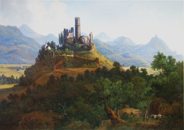 Editor: So this is Carlo Bossoli’s "Balaklava," painted in 1857. It feels vast, a huge vista with this almost dreamlike castle in the background. The figures in the foreground seem so small, yet they are placed at eye level with the viewer, grounding the whole piece. How do you interpret this landscape? Curator: For me, landscapes always represent something more than just geography; they become imbued with history, memory, and the narratives of the people who inhabit them or pass through them. "Balaklava", named after a significant Crimean war battle, carries the weight of that historical event, seen through the symbolic lens of the land. Do you notice the castle? What do castles mean to you, in terms of symbolism? Editor: A place of power, resilience...maybe a bit romantic, I suppose. Is the castle meant to be...Balaklava itself? It seems quite distant. Curator: Indeed, the physical distance is significant. Castles, historically, represent authority and control. However, distance lends it an air of perhaps unattainable safety or even a slightly haunting quality, considering the painting's historical context. Look at how Bossoli uses light. It isn't just aesthetic; it emphasizes certain features and diminishes others, creating a hierarchy of importance within the symbolic landscape. Light often reveals truth, or perhaps obscures it? Editor: So you're saying that even the seemingly "realistic" plein-air style can be loaded with symbolic meaning and not just a literal depiction? Curator: Precisely. This isn't just a record of a place, but a meditation on power, memory, and perhaps the cost of conflict rendered visible through the symbolic use of imagery and atmosphere. Editor: That's fascinating. I wouldn't have considered the layers of symbolism beneath what I initially saw as just a landscape painting. Thanks for broadening my understanding. Curator: And thank you. It is these subtle clues left by the artist that connects us, through history and conflict, allowing cultural memory to continue.