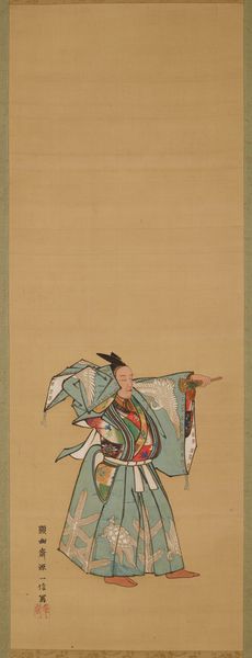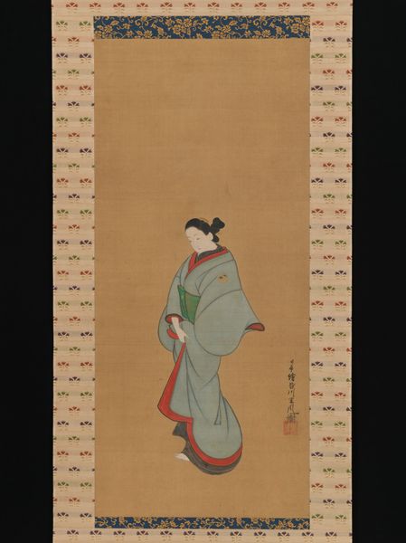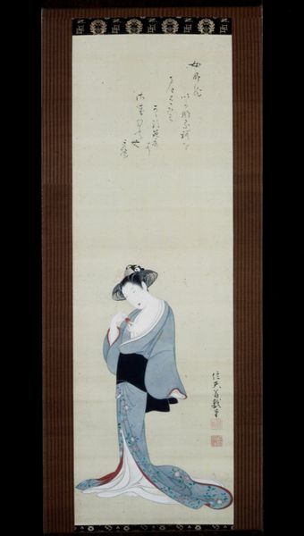 Editor: This watercolor, "Standing Courtesan," by Baiōken Eishun, from the 1720s, has a surprisingly delicate and reserved quality to it, especially considering the subject. The figure almost seems to be looking inward. How do you interpret this work, given its cultural context? Curator: It's vital to acknowledge that this painting exists within the ukiyo-e tradition, literally 'pictures of the floating world.' It reflects the Edo period's embrace of transient pleasures and entertainment. How might this impact our reading of the courtesan’s portrayal, especially her seemingly subdued posture? Editor: I see what you mean. It seems contradictory. Ukiyo-e celebrated the pleasure quarters, yet here the courtesan isn’t overtly sensual or joyous. Is that a deliberate artistic choice? Curator: Precisely! Let's consider her social position. Courtesans were often educated and influential figures, but still existed within a rigid societal structure. Eishun’s depiction, with its emphasis on quiet dignity and interiority, can be read as a subtle commentary on the constraints placed upon women, even within seemingly liberated spaces. The muted colours might subtly convey this restriction. Don’t you think? Editor: That’s fascinating. So, the painting becomes more than just a pretty picture; it's a statement about gender and societal expectations. I was initially drawn to its aesthetic qualities, but understanding its historical and social dimensions makes it much more powerful. Curator: Exactly! By viewing art through an intersectional lens, we unearth narratives often overlooked by purely formal analyses. Thinking about these complexities truly transforms our experience of the work, don’t you think? Editor: I agree entirely. It definitely gives me a new appreciation for the painting. Thanks so much!