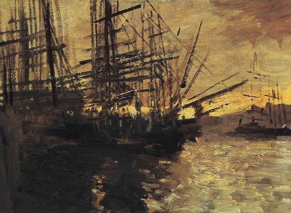 Curator: Here we have Claude Monet's "Ships in Harbor," an oil painting completed in 1873 and held at the Museum of Fine Arts, Boston. It is a classic example of plein-air painting, marked by his distinctive impasto brushstrokes. Editor: The painting strikes me as somewhat melancholic. The palette is quite muted, a range of greens and grays dominating the scene. Despite the vibrant touches, there’s a quiet stillness. It makes me ponder on issues of maritime trade. Curator: Monet's focus here isn’t necessarily to romanticize trade itself but rather to explore light and atmosphere. Ships become vehicles to play with reflections and shadows, capturing a transient moment in the harbor. The symbolism of the ships is less about their function, and more about their form. Editor: I'm intrigued by your distinction of their forms! Ships in harbors always suggest points of departure and return, potential mobility and sometimes, even exploitation, particularly in a 19th-century context. Perhaps that perceived melancholia I noted originates from these very considerations of global movement. Curator: The image echoes motifs of leaving, returning, and exchange—and ships indeed held a distinct social status, connecting far-flung communities. Consider that this was done *en plein air*, suggesting that this artwork should capture that feeling in a moment! That the impression could bring up historical considerations. Editor: Indeed. This work now strikes me as less an objective portrayal, and rather an engagement with memory. Each stroke adds nuance and subjectivity to the narrative. Looking closer, the seemingly simple rendering, those quickly applied marks, suggests a deep understanding of not just the physical properties of water and light, but also of the cultural symbolism inherent within maritime settings. The water, however still it is, can be read as full of historical charge. Curator: That's a valuable reminder, isn't it? That even an impressionistic harbor scene carries profound traces of historical weight and collective emotions. It’s remarkable to reflect on the ways the impression left on us in turn resonates back through culture and meaning. Editor: Precisely. This encounter prompts contemplation—inviting questions regarding history and cultural memory beyond its apparent impressionistic tranquility.