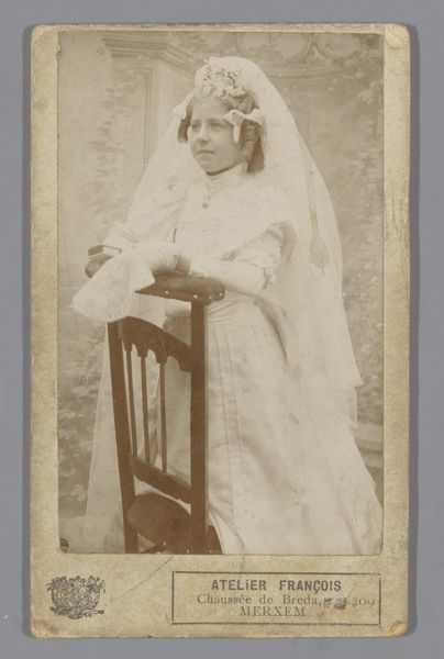 Curator: Looking at this photograph, “Portret van een onbekende meisje, vermoedelijk als communicant,” created sometime between 1880 and 1910 by Adrien Bombeeck, I'm immediately drawn into her gaze. What about you? Editor: It has such a weight of…absence? You know, like a ghost trapped in the albumen. The veil blurs the edge of her face, and all the intricate craft in this picture feels dedicated to rendering the girl's delicate spirituality visible, making devotion almost palpable. Curator: Visible, definitely, in the choice of albumen printing, a photographic process favored for its ability to render fine detail and subtle tones. It feels meticulously staged doesn’t it, this ritual? There's the veil, the rosary, and that intricately carved pedestal – all contributing to the performative aspect of faith during that era. Editor: Precisely! Consider the labor invested—cultivating eggs for the albumen, coating and sensitizing the paper, posing the subject just so. It's about more than just the image; it’s the confluence of industrial chemistry, manual skills, and, yes, maybe a budding industry capitalizing on sentimental family keepsakes. Also, I find the pedestal is very suggestive; it really raises the sitter, even if this elevates her symbolically. Curator: I find it's intriguing to think about how her likeness, captured through light and chemistry, was intended to exist and circulate within a family or community. It transforms her identity from the particular to something more representative or aspirational. What feelings did this album-sized photograph inspire? Editor: Well, on the one hand there’s something profoundly intimate about these kinds of images—it gives you access to a world that existed long ago in time. This image acts almost like a holy card and serves as a reminder to seek that transcendence; but on the other hand the technology used, along with all that went into capturing her likeness, served to distance us in many ways. In doing so it allows us to experience her youth in a rather more melancholic or even sentimental fashion. Curator: Perhaps there's some tension then, between what the technology was capable of and the sitter, because even after a century or so, she looks alive to us; looking into our world; maybe this has turned out well for all parties!