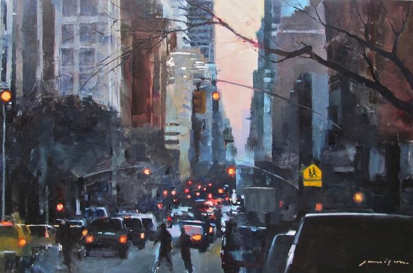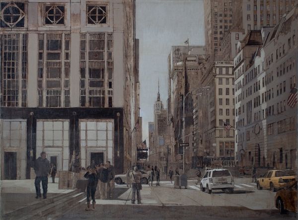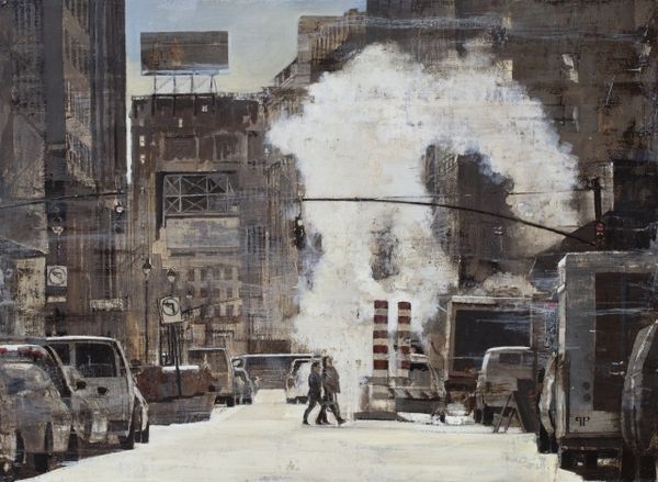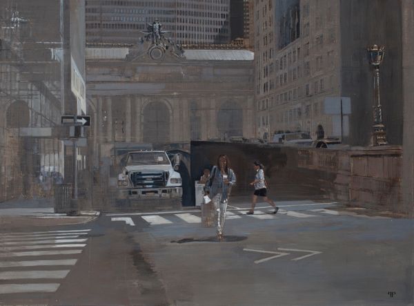 Patrick Pietropoli painted this version of Times Square with oils in a way that captures the feeling of being overwhelmed by visual information, wouldn't you say? Look at the texture! It feels like he’s built up these layers and layers of paint in shades of grey and beige – it’s almost sculptural. This isn't about clean lines or perfect representation, but more about the process of seeing and trying to capture the essence of a place. There’s a real tension between realism and abstraction, especially in the way he handles the light. Notice the blurred edges, the muted palette, and the way the buildings seem to melt into the sky. All of this is very reminiscent of Gerhard Richter's paintings of urban landscapes, with their ghostly atmospheres and sense of transience. It's like he's saying that the city is always changing, always in flux. And, of course, there's no single, correct way to see it.