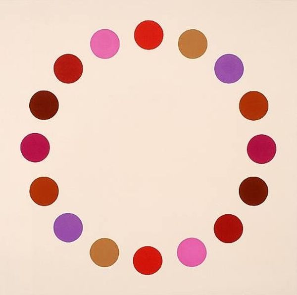 Thomas Downing made Horseshow Two, a painting with acrylic on canvas, and you can see how he built it dot by dot. The off-white ground is painted thinly, allowing the canvas texture to breathe through, like a whisper. But then, look at those circles. Each one is a clean, solid color, but with slight variations in density, like you’re looking at stained glass. Downing used various brushes to dab them onto the canvas, creating a slight halo effect around each dot, blurring the line between precision and chance. I keep returning to that maroon color dot. It's so earthy and grounded and anchors the whole piece, like a full stop at the end of a sentence. Downing’s use of color and simple form reminds me a little of Kenneth Noland's target paintings, but with a softer edge, more like a meditation. It reminds you that art is not about perfect outcomes, but about the playful process of seeing.