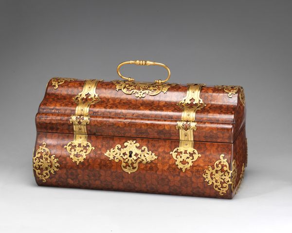 Curator: Oh, I'm instantly drawn to its understated elegance. It's a box, clearly, but there’s a kind of silent story whispered within those leather confines, don't you think? A journey in transit perhaps? Editor: Absolutely. What we’re looking at is a "Leather Case for a Service" created circa 1765-1770. The leather is accented by both metal and wood, revealing a little about luxury practices from this period. It gives material form to concepts of access, hierarchy and trade routes of objects used during that time. Curator: Access for whom, exactly? Was this somebody's high-society picnic basket? I mean, I can imagine elegantly gloved hands opening it up to reveal, I don’t know, delicate porcelain teacups. Editor: More likely it would be owned by someone of high status who possessed influence. Tea, coffee, spices. These luxury objects were steeped in colonial legacies of wealth extraction. What might be inside, whether the object, tool or even artwork, always implies class status in the Rococo era. Curator: A box of class consciousness, alright. And there's something deeply appealing about that aged patina and the worn edges, each scratch probably tells its own story of carriage rides and forgotten picnics. I feel the romance in it. But you’re right, these stories don't begin with the aristocracy that enjoys them, of course. Editor: Precisely! The gold trim is such an emblem of that era and class too. Consider how this ornate touch signifies the appropriation of wealth acquired by otherized labour! Even the materials tell us how connected these so called private moments are connected with a deeply public extraction. It can also speak to the gendered dynamic of consumption at play: many luxurious containers served a predominantly feminized clientele. Curator: It almost feels voyeuristic, peering into someone's forgotten boudoir from 1770. Perhaps this box can remind us to look critically, imaginatively and compassionately at even the simplest object, and where its many beginnings can tell a broader story! Editor: Well said. Seeing this "Leather Case," hopefully helps us examine not only an individual artifact but the interconnected histories it embodies, pushing us to consider the unseen laborers behind such luxurious display, and the complex networks of power and extraction at its foundation.