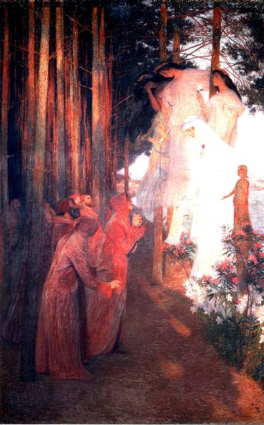 Alphonse Mucha made this painting, Age of Love, at an unknown date using what looks like a whole lot of dreamy green paint! It's like stepping into a hazy memory, isn't it? Looking closely, you can see how he’s layered those greens, some thin and washy, some thicker, almost glowing. I love how he's built up the texture around that glowing doorway in the distance, it's as if the light itself is a tangible thing. Notice the marks on the ground of this circular space; there’s something very gestural and free about them. The overall effect isn't about perfect clarity, but about capturing the feeling of a collective human experience. You can almost feel the joy and the gravity of it all. You know, in a way, it reminds me of Odilon Redon, that same embrace of the mystical and the personal. It makes you think about how painting isn't just about showing something, but about feeling something, too.