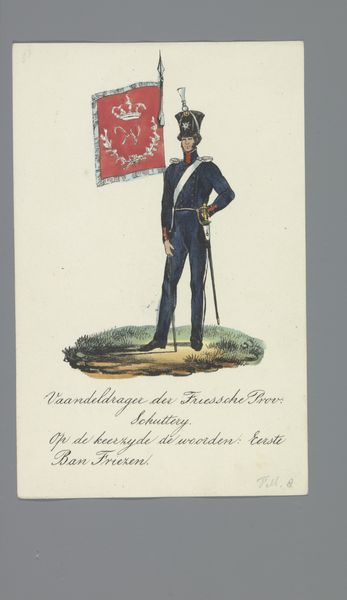 This watercolor work by Albertus Verhoesen portrays a standard-bearer of the Overijsselsche Schutterij. The flag he bears is emblazoned with heraldic symbols—a crowned shield flanked by lions. These emblems are not mere decorations; they speak volumes of lineage, power, and identity, harking back to medieval heraldry. Consider the lion, a motif stretching back to ancient Mesopotamia, often embodying courage and regality. Its recurrence across cultures—from the Lion Gate of Mycenae to the Lion of Saint Mark in Venice—reveals a persistent human need to align with the animal's symbolic strength. Yet, here, the lions support a Dutch coat of arms. This reflects a transformation, a shift from primal power to civic pride, influenced by historical and cultural contexts. The potent symbolism creates a powerful force, engaging viewers on a deep, subconscious level. These symbols are not linear, but cyclical, resurfacing and evolving, taking on new meanings.