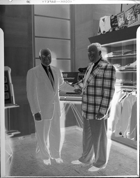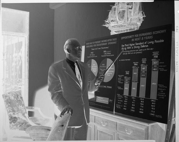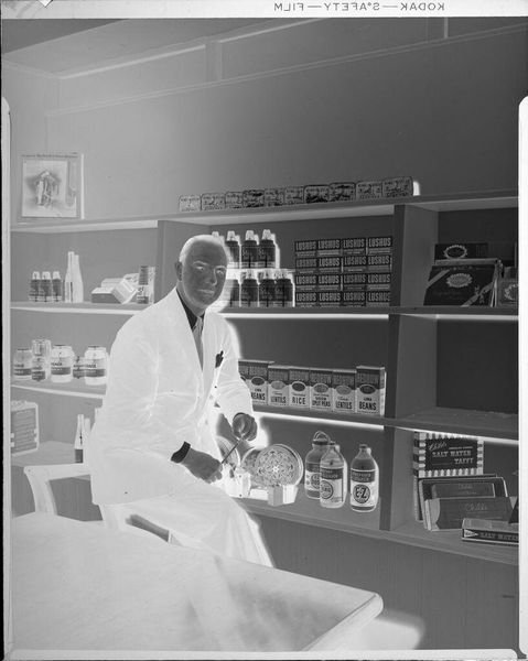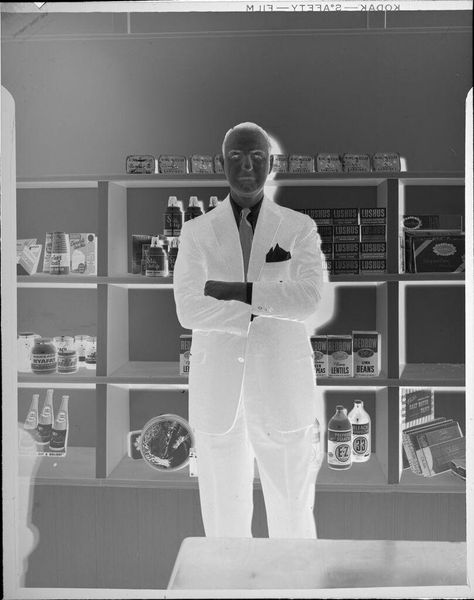 Editor: This photograph, "Untitled (man pointing at products on shelves)" by Peter James Studio, presents a seemingly mundane scene. The stark contrast between light and dark is striking. What compositional elements stand out to you? Curator: The inverted tonality immediately disrupts our conventional reading of the photograph. Note how the geometric rigidity of the shelving is offset by the organic curve of the figure. The tension between these forms creates a visual dissonance. Editor: So the interplay between form and light directs how we see the narrative? Curator: Precisely. The photograph's meaning isn't inherent in the subject matter but rather emerges from the formal relationships: the contrast, the shapes, and the overall composition. The gesture of pointing becomes secondary to the visual language itself. Editor: I see, it’s about the relationships between the formal elements of the image. Curator: Indeed. Our reading hinges on understanding these relationships.