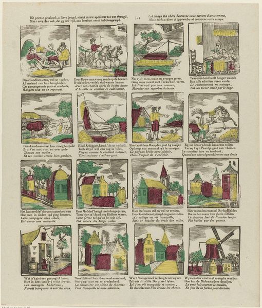 Franciscus Antonius Beersmans created this lithograph titled 'Luilekkerland / Pysa de cocagne'. The work presents a series of vignettes depicting a land of plenty. Originating in the Medieval period, the concept of "Cockaigne" described an ironic paradise, satirizing peasant life with exaggerated leisure and food. Beersmans' images echo this sentiment, depicting people effortlessly acquiring food and drink. The imagery reflects societal anxieties about scarcity, labor, and social hierarchies. These scenes are rife with symbolic inversions of labor and reward. Consider how the figures interact with the landscape; food is readily available, challenging the traditional relationship between work and sustenance. This resonates with historical peasant revolts which questioned the existing social order. How might the emotional impact of this imagery shift, depending on the viewer’s position in the social hierarchy?