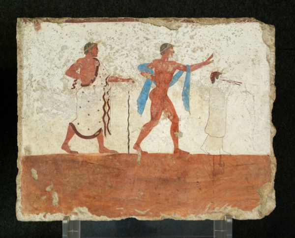 Editor: Here we have a fresco from the Tomb of the Diver in Paestum, Italy, created around 470 BC. What strikes me is its surprisingly casual depiction of what I presume is a symposium; it’s fascinating to see something so personal from so long ago. How do you interpret this work? Curator: It is indeed remarkable! It provides invaluable insights into social practices. Think about where this was found - a tomb. Placing a scene of communal celebration within a funerary context speaks volumes. How does it challenge or confirm your expectations of ancient art? Editor: It's more lively and… domestic than I expected, given the somber setting of a tomb. Most ancient art I've encountered feels grander, more concerned with gods or rulers. Curator: Precisely. It serves as a counter-narrative. What this image offers us is not necessarily the dominant narrative of gods and rulers but glimpses into social interactions, reflecting the lives of the elite class who could afford such monuments. Why do you think these frescoes are so important for the public? Editor: They make the past feel less distant, more human. History isn't just kings and wars; it’s also these everyday interactions, these shared experiences, and this allows a better engagement with what we might think of as an "official" or formal narrative. Curator: And the display of these scenes within a tomb. Reflect on what that signifies about their beliefs regarding life, death, and the afterlife, especially in the politics of imagery around ancient societies, their power structures, and social values. Editor: So, seeing everyday life depicted in a tomb… maybe the ancient Greeks valued social bonds even in death? Thanks for offering this unique lens to view this artwork! Curator: Absolutely, and reflecting on that relationship shapes the continued reception and power dynamics around how we view the imagery even today!