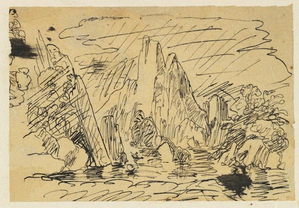 Editor: Erich Heckel's "Am See," created in 1915 using ink and watercolor, strikes me as quite chaotic, but also full of youthful energy. The figures are so loose and gestural. What do you see in this piece? Curator: I see a ritual of cleansing and renewal played out through imagery deeply rooted in human history. Water, in almost every culture, symbolizes purification, transition, and the subconscious. Look how Heckel uses swirling, almost frantic lines to depict the water, creating a sense of turbulent energy. Editor: Yes, and the figures on the pier – are they about to jump in? Is this about bravery? Curator: Perhaps. But consider the composition as a whole. The pier might represent a liminal space, a threshold. These figures stand at the edge, about to cross into the unknown. Jumping into water symbolizes leaving behind old selves, daring a plunge into the transformative power of the collective unconscious. Does that imagery ring a bell for you, or provoke some thought? Editor: Definitely! That makes the slightly unsettling quality of the piece more apparent – like it's not *just* fun and games. Curator: Exactly. Note the expressions, or lack thereof. They're archetypes more than individuals, representing universal stages and shifts of human experience, stripped bare to convey primal anxieties, communal catharsis, and cultural renewal during that troubled time in 1915. Editor: That really changes how I see it. Thanks. I initially just saw a group of people at a lake, but now it feels heavy with cultural and symbolic meaning. Curator: Precisely. Art often works like that: seemingly simple scenes reveal depths of human experience, connecting us across time through shared visual language.