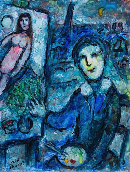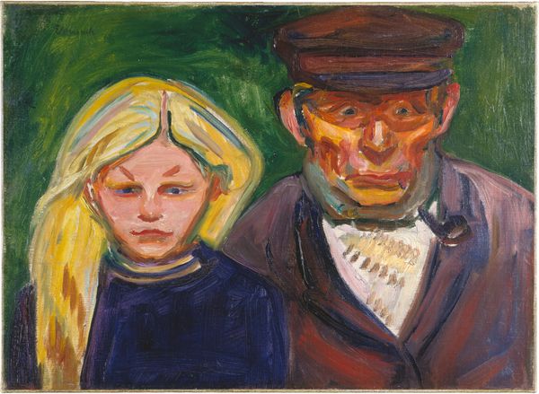 Editor: Munch's "Jealousy," painted in 1913, is… striking, to say the least. The swirling oil paints and the expressions on their faces—especially the man in the foreground—create such a raw, anxious mood. I can't help but stare, though it makes me uncomfortable. What do you see in this piece? Curator: Ah, yes, the discomfort is palpable, isn’t it? Munch had a way of laying bare those gnawing emotions we try so hard to bury. Look at the colours – the almost sickly greens and yellows clinging to the faces. It's not just a portrait, is it? It’s the physical manifestation of an inner torment. Have you ever felt like that? Like jealousy was a colour staining everything you see? Editor: I... think so? Maybe not to this extreme. I do wonder about the woman in the middle. She seems so detached, almost serene. Curator: Exactly! And isn’t that the dagger twisting in the jealous man's heart? Her indifference, real or perceived, is what fuels his agony. Is she oblivious or is she enjoying this… silent drama? It’s a question Munch leaves deliciously unanswered. Munch loved to dance around such topics – love, anxiety, death. They’re not things you can easily pin down. Editor: It definitely gives you a lot to think about. And it almost makes me feel grateful that most of my experiences of jealousy haven’t been rendered into paintings for all to see. Curator: Precisely! Art at its best can give a person space to reflect upon difficult subjects and find some light at the end of the tunnel. Thanks for highlighting such a relevant piece of art!