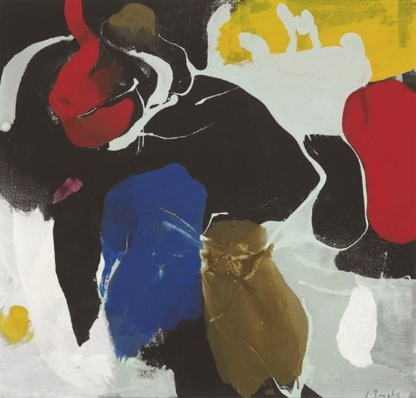 Editor: Here we have James Brooks’ "Orrib" from 1967, made with acrylic paint. I’m struck by how the artist balances these strong, almost clashing colours. The composition feels really dynamic and I am wondering what to make of it. What do you see in this piece? Curator: Notice first the interplay between the black masses and the fields of saturated color. Brooks uses these contrasting elements to create visual tension. The white areas, particularly in the center, act as a kind of focal point, but they are fractured, preventing the eye from settling. How does this fractured, unsettled quality affect your understanding? Editor: I think it makes me feel slightly anxious, actually. It is like these shapes are struggling to contain themselves within the canvas. It's all quite visceral. Curator: Indeed. Consider, too, the way Brooks applies the paint. Observe the visible brushstrokes and the almost raw texture of the surface. The materiality itself becomes a significant part of the artwork's language. The formal qualities generate significant emotive potential. Do you find the texture adds to this sense of tension? Editor: Definitely. It’s not smooth or blended. The rough texture and stark colour contrasts makes the work quite powerful, maybe even slightly aggressive? Curator: Precisely. It's through the formal elements that Brooks communicates. Color, line, texture – these are not merely decorative. They constitute the core meaning. The abstraction facilitates greater emphasis on the components. Editor: That’s fascinating! I initially thought it was about pure expression, but seeing how carefully considered those choices are gives me a totally different understanding. Thanks for explaining that. Curator: My pleasure. It's through rigorous visual analysis that we can truly begin to decode the artist's intention and the artwork’s complex, often unspoken, language.