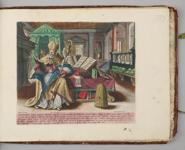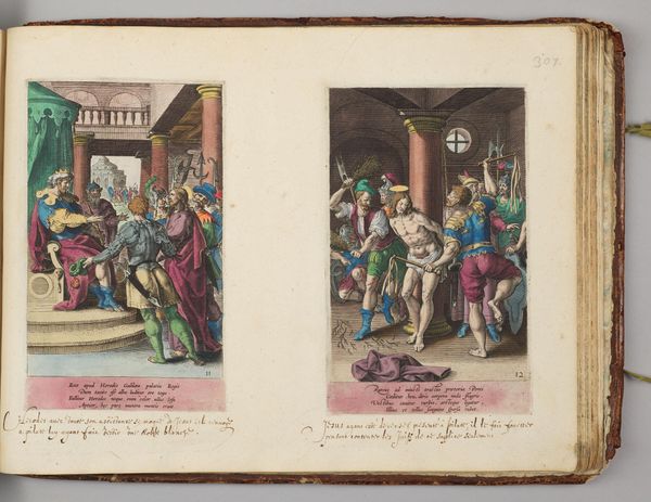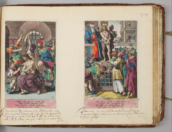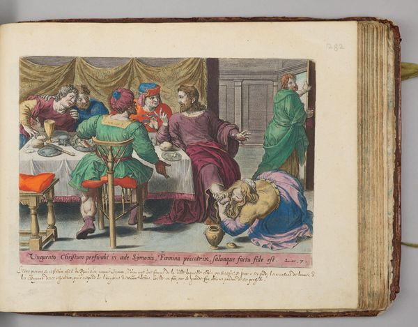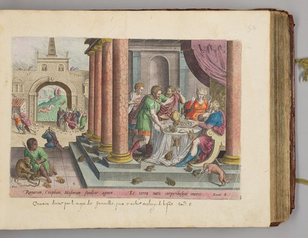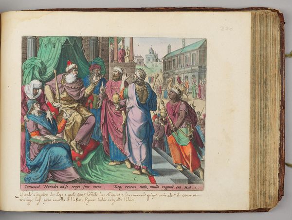 Editor: This print, "Esther before Ahasuerus," captivates me with its vibrant colors and the theatrical drama of the composition. The figures, though small, are so expressive. Curator: Indeed. Hans Collaert the Elder, the artist, would have relied on printmaking workshops to create this piece. Consider the socio-economic context of print production at the time. Editor: The formal elements create such a stark contrast – the King's imposing figure against Esther's desperate plea. And that little dog at the King's feet adds such a touch of humanizing charm! Curator: The materials also speak to the availability and circulation of images during this era. Editor: The way the space is constructed is interesting; it almost feels like two different plays happening on the same stage. Well, it’s been fascinating to reflect on this artwork. Curator: Agreed. Examining its materiality provides insights into the artist’s engagement with production practices.