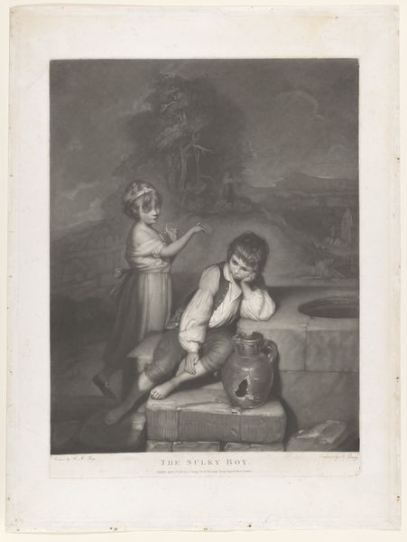 Curator: So, we’re looking at "June," a print made by Francesco Bartolozzi after William Hamilton, dating back to 1789. It offers a scene of rural life in England, found here at the Met. What strikes you immediately about it? Editor: It's the softness, the muted tones, the overall gentleness of the image that captivates. There’s a pleasing circular composition within the oval frame and the figures are elegant, despite their work. Curator: It's an idealized version of labor, certainly. Hamilton was known for these pastoral scenes catering to a growing interest in rural romanticism. The image coincides with the era of enclosure in England, but does little to explore that impact. This sort of imagery helped construct national identity around land ownership and productivity. Editor: True, the social commentary is indeed absent, allowing a focus on pure form. Consider the lines leading our eye through the composition, from the figures in the foreground to the distant landscape, subtly organized, it presents a balance and serenity. Even the text surrounding the picture feels like another art element in its location and careful design. Curator: And that text underscores the image's intent – it idealizes a sense of rural abundance at a time of real economic stratification and displacement. It offers, then, not an unmediated window, but a highly crafted image, speaking to specific social fantasies of an agrarian golden age. Consider the implications in contrast to urbanization that drove production! Editor: A powerful contrast indeed! So, the technical facility paired with the symbolic framing creates an emotionally complex artwork where nostalgia, political evasion and pure aesthetics strangely combine and communicate, however quietly. Curator: Precisely. It really does invite us to reflect on art's dual role—its aesthetic properties intertwined with social and political dimensions. Editor: The composition guides a narrative while obscuring its deeper context; quite the paradox.