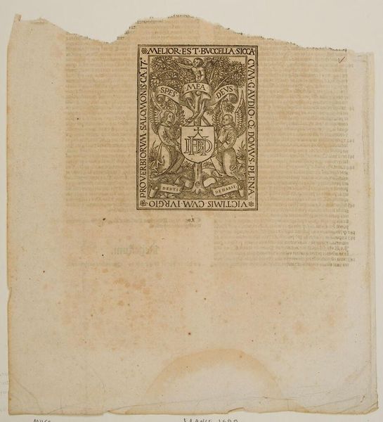 Editor: Here we have an anonymous work entitled "Printer's Mark" housed at the Harvard Art Museums. It strikes me as a symbolic representation of craftsmanship, perhaps guarding knowledge. What can you tell me about its historical context? Curator: Printer's marks like this were crucial for establishing a printer's identity and reputation. They acted as early forms of branding. Consider how this image projects the printer’s values through heraldry and symbolism. Editor: So, it’s not just a logo, but a statement? Curator: Precisely! The imagery used reflects the printer’s desired association with certain ideas or patrons. Editor: That makes me think differently about visual communication today. Curator: Indeed. The politics of imagery have long shaped our perception of information.