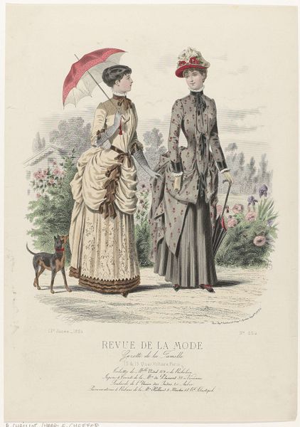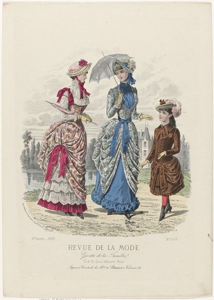 This print, Revue de la Mode, Gazette de la Famille, created by A. Chaillot in 1886, presents a formal study in contrasts, composed through color and line. The juxtaposition of the two figures, each adorned in distinct attire, creates a dynamic tension. The figure on the left, marked by bold, diagonal stripes, counters the soft, cascading lace, creating an intriguing push and pull. The figure on the right presents a contrast in color and form, with solid mauve juxtaposed against gold. The artist’s use of vertical lines elongates the figure, while the draped fabric introduces movement and volume. Here, fashion operates as a sign system, reflective of broader cultural codes and social identities. The attention to detail in the garments, from the cut of the fabric to the placement of embellishments, invites us to decode the sartorial language of the late 19th century. Fashion, after all, does not merely clothe the body, but communicates status, taste, and aspiration.