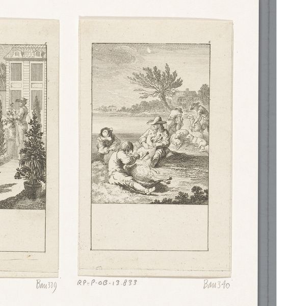 Editor: This is "Maaltijd met de kluizenaar" by Daniel Nikolaus Chodowiecki, created in 1771. It's an etching, so it has a lot of fine detail. It feels very theatrical to me. What strikes you most about this piece? Curator: I see a potent commentary on power dynamics. The scene depicts soldiers feasting with a hermit. What appears on the surface as a simple meal quickly unravels. The very act of armed soldiers sharing a meal with a man who has renounced worldly possessions presents a compelling visual paradox. How do we interpret the relationship between these figures? Are they seeking redemption, or is the hermit a symbol of resistance? Editor: That's interesting. I hadn’t thought of it that way. It could be seen as exploitative. Is it romanticizing power imbalances? Curator: Romanticizing, perhaps, but also critically engaging with them. Chodowiecki places this hermit, likely representing enlightenment values, face to face with armed soldiers. Consider the social context of 1771 – the enlightenment was challenging established hierarchies. The soldiers, symbols of the old order, engage in what could be perceived as a superficial interaction with the hermit’s simple life. This speaks to a superficial adoption of enlightenment ideals by those in power. To what extent, then, are their actions performative? Editor: I guess it's more complicated than just a casual get-together. I’m thinking about the hermit’s expression now, too. Curator: Exactly. The power of this piece resides in that ambiguity and the critical historical discourse it inspires. It invites us to look beyond the idyllic surface and question who truly benefits from this 'meal.' Editor: I didn't initially consider the context of the Enlightenment. It changes how I understand the work. Curator: Precisely. Art serves as a vital link to history, prompting us to reassess narratives and power structures within societies.