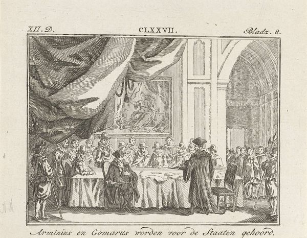 Curator: Here we have Conte Carlo Lasinio's depiction of "The Feast of Herod," an image brimming with tension. Editor: My initial feeling is that the stark, almost clinical rendering of this famous biblical scene clashes with the brutality of the story itself. All that stone! Curator: Well, notice how Lasinio employs line engraving to construct this dramatic space and meticulously render each figure. Editor: It’s fascinating how the architecture dwarfs the figures, turning them into mere elements within a larger power structure. All this stone and labor on display. Curator: Perhaps that's his point: to portray the banality of power as embodied in Herod's court. The dance, the beheading—all just another spectacle for the elite. Editor: Absolutely. The materiality of the print itself becomes a commentary on the production of spectacle, the way stories are consumed and reproduced. Curator: It leaves me contemplating how we, too, participate in these narratives, even now. Editor: Agreed. It makes me think about whose labor builds our own spectacles, and at what cost.