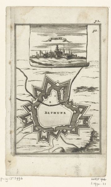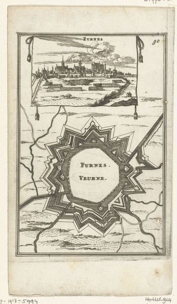 Editor: This print by Romeyn de Hooghe, from 1672, titled "Illustration for 'The Work of Mars' by Allain Manesson Mallet," presents us with this fascinating, almost scientific depiction of Dixmude. It feels very formal, yet the star-shaped fortress also feels very dynamic. What stands out to you? Curator: The star fort immediately grabs my attention. Its symbolic resonance throughout history is fascinating. Do you notice how the geometric shape seems to push outward, almost aggressively? Editor: Yes, it's almost vibrating with energy! It seems to dominate the cityscape above it. Curator: Indeed. Consider that this geometric fort becomes a symbol of control, order, and ultimately, of military might during this era. The "star" is both beautiful and imposing. Doesn't this recall other star-shaped symbols used to assert power – think of royal emblems and the wayfinding compass rose. What are the cultural associations connected to the symbol of Mars, specifically? Editor: Well, Mars represents war and strategy, obviously. So, this image uses the formal scientific elements of maps, blending cityscapes, star forts, with warfare and military control of both land and people. It is a layered representation of power. Curator: Precisely. It’s fascinating how this seemingly objective illustration becomes infused with layers of meaning – the projection of authority and territorial ambition represented visually. What have you learned looking at this work more closely? Editor: How symbolic form and imagery, even in maps and architectural renderings, can shape perceptions and cultural memory around themes of war, power, and place. Curator: Absolutely. The enduring power of symbols allows these older maps and prints to communicate even now.