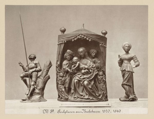 Editor: We're looking at "Relief of the Death of Mary," an anonymous sculpture dating from 1869 to 1887, currently housed at the Rijksmuseum. Carved from wood, it presents a poignant scene with many figures gathered around a central bed. What strikes me most is the somber gravity of the piece. What historical context informs its emotional impact? Curator: The late 19th century saw a surge in historicism, and this piece reflects a fascination with medieval artistic styles and religious themes. It's interesting to consider how the relief form itself, traditionally used to adorn religious buildings, imbues the scene with a sense of public ritual and shared mourning. How do you see the arrangement of the figures contributing to that feeling of public display? Editor: The gathering around Mary feels like a community's shared grief, staged almost. There’s a performative aspect, maybe meant to inspire similar emotions in viewers. I'm curious about who was commissioning art like this at the time. Curator: Precisely. Remember the 19th century was an age of growing nationalism and religious revivalism. Patrons – often wealthy individuals or religious orders – sought to promote specific values and strengthen social bonds through art that evoked a shared past. Think about the rise of museums during this period as well – places that solidify and display a certain kind of historical narrative. How might this relief function differently inside and outside a museum setting? Editor: That makes sense. Inside a museum, it's preserved as art history; outside, perhaps in a church, it has more of a living, devotional role. I never thought about how much the museum environment itself affects how we view such pieces. Curator: Exactly. The Rijksmuseum setting gives it an added layer of meaning that maybe was never meant for. I’ve always loved looking at art with fresh eyes! Editor: Me too. Thanks for shedding light on the social dimensions; it's broadened my appreciation for this powerful relief.