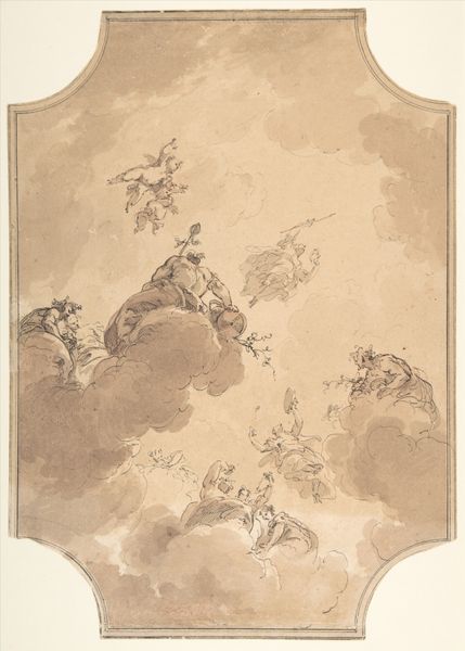 Curator: Let’s take a look at Jacob de Wit's “Study for a Ceiling: Allegory of the Harvest with Dionysus and Ceres.” This preliminary drawing gives us insight into the planning for a large-scale ceiling fresco. Editor: Immediately, the swirling composition evokes a sense of abundance and divine celebration. I see figures floating amidst clouds, a visual language of Baroque apotheosis, but in a monochrome study. It’s intriguing. Curator: De Wit was celebrated for his ability to create illusionistic ceiling paintings. He understood the importance of conveying themes of prosperity and the power of patrons. The use of classical deities reinforces societal structures. Editor: The choice of Dionysus, god of wine, and Ceres, goddess of agriculture, is potent. Together, they encapsulate both pleasure and sustenance—essential ingredients for societal well-being, wouldn't you say? The image would reassure a patron of unending luxury. Curator: Exactly. Baroque art often aimed to display power through allegorical language, blending it with classical imagery and using figures to enhance that symbolism. Frescoes themselves also represent power due to how challenging they are to make, especially ceiling pieces. Editor: Consider the emotional weight. The upward-gazing figures direct our eyes towards the heavens, implying not just earthly abundance but divine blessing. These floating cherubs, for example, feel symbolic not only of childlike purity but divine grace in how they carry fruits of labor to these Gods. Curator: It's fascinating to see the early stages of a project like this. Knowing that De Wit then expanded this sketch onto a massive ceiling alters how we understand these quick, energetic marks. It brings the monumental into reach by breaking down his methods. Editor: For me, examining a preparatory study invites contemplation of the creative process and it’s symbolic seeds. A sketch allows one to see an artist's intentions in their most elemental stage. I find I get more insight by seeing less, almost like getting the first look at the building block of the larger theme. Curator: This preliminary work underscores the connection between artistic skill, visual storytelling, and the construction of public perception and patronal image. A complex web visualized by relatively little visual material. Editor: Seeing how simple means give way to potent allegorical imagery is something rather miraculous indeed. Thanks for bringing this drawing to light.