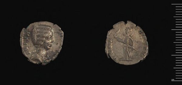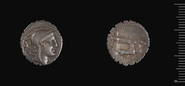 Editor: This is a serrate denarius made by Ti. Claudius Nero. It's a small silver coin with what looks like a portrait on one side. What strikes me is how it connects ancient power to everyday transactions. What historical narratives do you see embedded in this piece? Curator: The denarius is more than just currency; it's a potent symbol of Roman authority. The figure on the obverse often represents a deity or a personification of Roman virtue, while the reverse could depict scenes of conquest or prosperity. Consider how this coin circulated – what stories did it tell about Roman power as it passed through different hands, across different social classes? Editor: So, it’s like propaganda in your pocket? Curator: Exactly. This small object carries a heavy weight of cultural meaning, reflecting the social hierarchy, political ambitions, and even the religious beliefs of the Roman world. Examining this coin allows us to understand how power was communicated and maintained in antiquity. Editor: That's fascinating. I never thought about a coin carrying so much meaning. Thanks! Curator: My pleasure. It is always important to think about whose stories are being told, and whose are being left out, even in something as small as a coin.