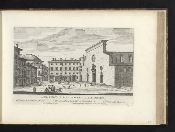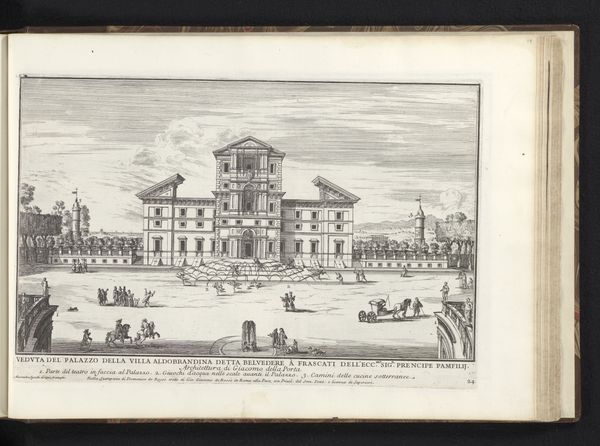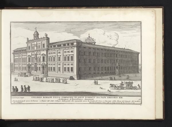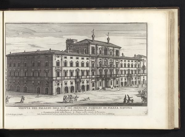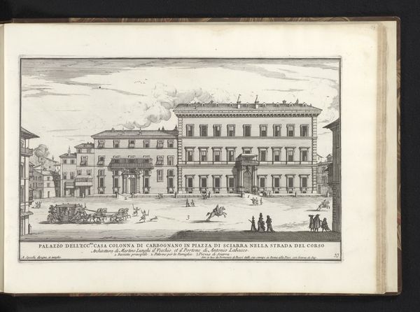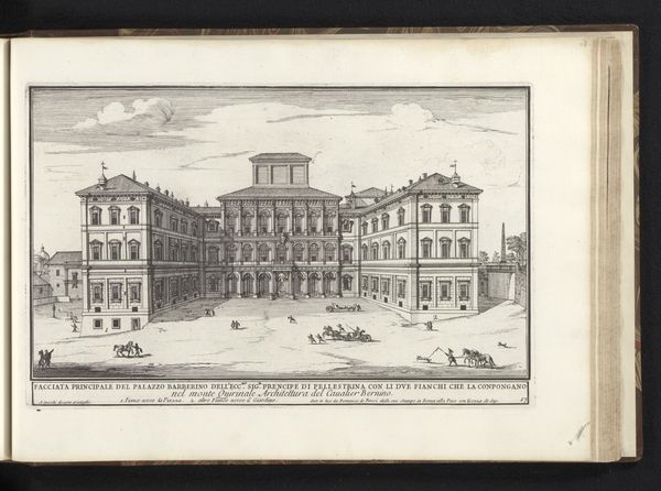 Editor: Here we have Alessandro Specchi's "Palazzo Barberini te Rome," an intaglio print from 1699. The crisp lines of the engraving depict a grand architectural structure, yet the scene feels strangely uninhabited. What symbols or underlying narratives do you see at play in this cityscape? Curator: It’s interesting you mention the absence of vibrant life, because the emptiness allows for deeper contemplation of power. Baroque architecture often functioned as a symbol of authority. The Palazzo Barberini, grand as it is, becomes a vessel for conveying the Barberini family’s influence. Notice how the figures are dwarfed by the building. Does that speak to you? Editor: Absolutely. It’s like they are props to enhance the grandeur of the building itself. Is it designed to inspire a certain feeling? Curator: Precisely! The feeling of awe, perhaps even insignificance, in the face of immense power. Think about what the intended audience for this print would have felt. How might viewing this image have solidified their understanding of the Barberini family’s status? It becomes a symbol not just of wealth, but of enduring legacy and control. Editor: That's fascinating. I was focused on the visual, but understanding the symbolic intention behind its creation really shifts my perception. Curator: Indeed. These printed images spread ideas as much as information. The print is a tool to influence perceptions of the Barberini family. Understanding the symbols used allows us to decode the message they were sending, then and even now.