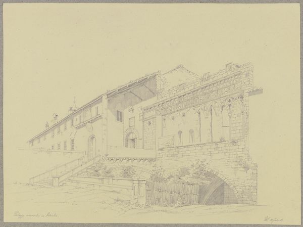 Ludwig Metz made this drawing of S. Scolastica near Subiaco with graphite on paper. A seemingly simple medium, but capable of great subtlety. Look at the light touch with which Metz has captured the architecture. He uses a range of mark-making techniques, from hatching to stippling, to describe the stone surfaces and architectural details. The linear qualities are precise, capturing the structural logic of the church. The material's inherent qualities, like its smooth texture and ability to create fine lines, allow for a detailed representation. This approach aligns with the tradition of architectural drawing, where accuracy and clarity are valued. Yet, the drawing also transcends mere documentation, embodying a sensitivity to light and form that elevates it to the realm of art. The drawing underscores the importance of materials and making in understanding an artwork, even one that appears straightforward.