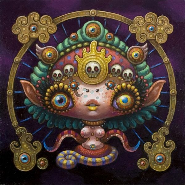 Editor: Here we have Yoko d’Holbachie’s *Dreaming Three Eyed Fish*. The work is done in acrylic paint, featuring… well, a three-eyed fish. There's such a whimsical and slightly unsettling aura. What initially strikes you about this piece? Curator: Unsettling is a brilliant word! It feels like a portal, doesn’t it? This collision of the cute and the bizarre – those oversized eyes, the strange crown – it speaks to the surreality bubbling beneath our everyday. D'Holbachie pulls from that shared dreamscape, where a fish becomes a monument to altered perception. Do you sense any nods to specific artistic movements in her style? Editor: I definitely see hints of Pop Surrealism and maybe a touch of Fantasy Art? All those bright colors are definitely eye-catching. Curator: Exactly! She expertly blends the accessible pop aesthetic with the more introspective, dreamlike quality of surrealism. And there’s a playfulness, isn't there? The almost cartoonish quality combined with unexpected details creates this fascinating tension. The artist uses those colors to suggest depth but they almost fight to distract the eye from the emotional narrative! Do you think there is a story here or are these images all surface? Editor: I'm on the fence! On the one hand, those eyes make me want to give her a hug, and on the other hand I'm afraid the tentacles may attack me! But seriously, it's got this magnetic quality... It makes me want to analyze every nook and cranny! Curator: And isn’t that the delicious trap of a great piece? It beckons us to unravel its secrets, while always holding something back. It seems d'Holbachie wants to take us on a subconscious safari! Editor: Totally, this reminds me to expect the unexpected from art! It is way more layered and creative than I gave it credit for!