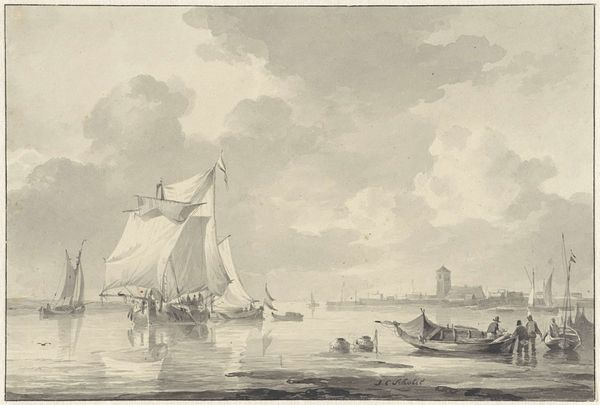 Editor: Here we have Jan Bulthuis's "'s Lands Zeemagazijn na de brand, 1791," a graphite drawing of a cityscape post-fire. I'm struck by the use of linear perspective to create a sense of depth, but the damage also brings an unsettling mood to what might otherwise be a pleasant scene. What draws your eye when you look at this piece? Curator: The emphasis on structure is remarkable. Consider the interplay of lines; Bulthuis meticulously renders the Zeemagazijn’s architecture even as it's ravaged. The regular grid of windows contrasts dramatically with the jagged edges caused by the fire, producing a striking tension. Have you observed how the artist manipulates light and shadow to emphasize the texture of the damaged structure? Editor: Yes, now that you mention it, I see how the hatching and cross-hatching not only describe form, but also convey the rough texture of the fire-damaged facade. What does that contrast between geometric structure and the chaos of the damage suggest to you? Curator: The image sets up a compelling binary of order and disorder. This can be understood in the arrangement of formal elements, Bulthuis's sophisticated construction and deconstruction create not just an image, but also a discourse about resilience, decline and the power of a singular event to restructure meaning. The composition suggests more than just representation. How does that resonate with your understanding? Editor: That makes a lot of sense! I was so focused on the historical context that I almost missed how Bulthuis’s skillful application of medium is driving the image. Thanks for the fresh perspective! Curator: Precisely, considering formal language gives us ways of understanding what Bulthuis achieves here. Looking beyond the historical is enriching for anyone!