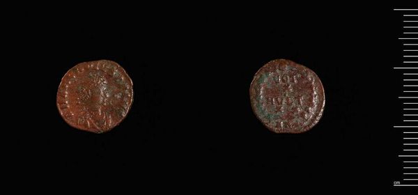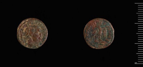 Curator: Looking at this coin, I feel a connection to something ancient, almost dreamlike. Editor: Indeed. This is a coin, designated AE4, minted under the reign of Valentinian II. It resides here at the Harvard Art Museums. Let's contextualize its significance. Curator: It's so small, yet I can almost feel the weight of an empire resting on it. What do you make of the imagery? Editor: The coin speaks volumes about power, legitimacy, and visual propaganda in the late Roman Empire. We see the emperor's image, intentionally crafted to project authority, but also religious symbolism to legitimize his rule. Curator: It's incredible how art, even on such a tiny scale, has always been used to convey messages, manipulate perceptions. Editor: Precisely. Think about the labor, the resources, the socio-political forces at play in its creation, and how we can still engage with that history. Curator: It makes me wonder about the hands it passed through, the stories it could tell. Editor: Absolutely. It's a tangible link to a world that shaped our own. A potent reminder of history.