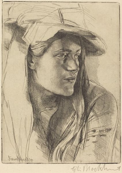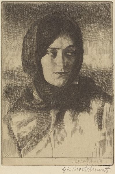 Curator: This is "Gulli II," an etching made in 1918 by Anders Zorn. Editor: There's an intensity in the woman's gaze. The use of shadow makes it feel both intimate and a little haunting, despite the seemingly straightforward portrait style. Curator: Zorn was known for his etchings, achieving remarkable tonal range through cross-hatching and varied line weights. The market at the time celebrated these virtuoso printmaking displays, solidifying Zorn’s status as a sought-after portraitist amongst the European elite. Editor: Looking at the sharp lines around her face, I wonder about the labor involved. Creating such detail by etching would require a precise process. Do we know about the economic situation for printmakers in 1918? Curator: Absolutely, the printmaking boom allowed artists such as Zorn to operate within networks of galleries that showed and distributed multiples to ever larger publics, influencing tastes and styles across broad geographies. It created an alternative market outside the formal Salon system. Editor: That access meant something different for the sitter, too, didn’t it? It's fascinating how her clothes become less defined the farther away we look from her face; like material possessions are not the subject of the piece. Curator: Exactly, her almost confrontational gaze gives an egalitarian mood to the piece. Though technically skilled and representative of its time, "Gulli II" reflects an interesting approach for such an in-demand artist; less idealized, more a character study. Editor: This makes me appreciate how Zorn highlights the skill required to transform a metal plate into something so emotionally resonant. You can almost see the manual process, like tool meeting the plate. It elevates it beyond just an image. Curator: Indeed, analyzing "Gulli II" unveils not just Zorn's mastery but the wider industry, public tastes and artist market strategies of early twentieth-century portraiture. Editor: And for me, it's in understanding the physical effort and social context involved in creating a relatively commonplace etching that elevates it, rendering the ordinary beautiful.