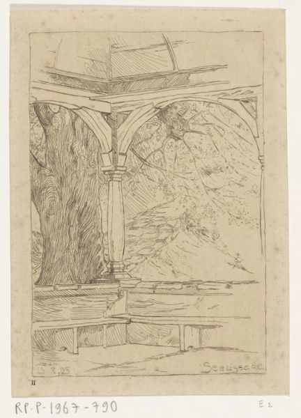 Willem Witsen made this print, 'Poort van Hotel Bellevue in Buitenzorg,' with etching. I love the way he's embraced the process, letting the marks speak for themselves. It’s like he’s thinking aloud with the needle and acid. Looking closely, you can see the plate tone gives everything a soft, hazy atmosphere, like looking through a dream. The texture of the paper adds to that feeling. The lines defining the gate and trees are delicate, almost tentative, but together they create a strong sense of depth. My eyes are drawn to the way the light filters through the trees in the distance, it’s quite magical. There’s a similarity here with Whistler, who also knew how to make the most of understatement. Of course, Witsen's not just copying. He brings his own sensitivity to the subject, transforming a simple scene into something deeply evocative. For me, this piece shows how art can be about asking questions, not just giving answers.