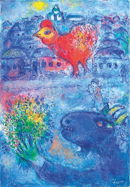 Curator: Welcome. Today, we're looking at a painting titled "Le Chat Et L'oiseau" by Cricorps. It appears to be an acrylic on canvas. Editor: The immediate impression is of a symbolic dance, isn't it? There's a stillness, yet an intense connection between the elements. The blue hues definitely set a melancholic, somewhat enigmatic tone. Curator: The layering is intriguing, isn't it? Look at how the acrylic-paint application, visible brushstrokes constructing both form and surface, create a textured interplay. I'd be interested in understanding the specific brand of acrylic used, whether there are visible aggregates, and the precise canvas weave chosen to cradle the composition. That underlayer peeking through… fascinating. Editor: Fascinating indeed, but more fascinating is the imagery: a cat and a bird. Cats, across cultures, often represent cunning or intuition, sometimes even the feminine divine. And the bird… typically, freedom, the soul, aspiration. Is it perched on the head like an intimate, unspoken truth? Curator: Right, but I see also how these familiar themes emerge not through refined precision, but the rough, the handmade. We can sense Cricorps actively manipulating a consumer product – acrylic – a medium accessible yet capable of serious art making. It invites an important conversation about where art making happens. Editor: Absolutely! It resonates within the Fauvist style—bold colors, flattened perspectives. However, it is difficult to trace explicit visual clues, or direct allegories without more biographical information about the artist’s social and cultural references. It does recall a certain modernist desire for simplification. Curator: Precisely, and I believe this invites discussion around labour, consumerism, artistic vision. Editor: Indeed. The conversation between predator and prey, visible and hidden—that dynamic captivates. I wonder if there are elements here related to cultural anxieties or mythologies of that interaction. It will stay with me. Curator: I agree. I leave more focused on production processes as informed by economics and cultural history, which further helps ground artistic production and material conditions in real historical circumstances. A very provocative study indeed.