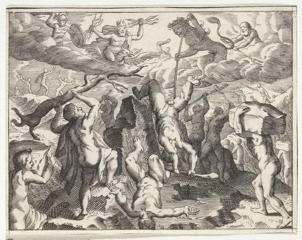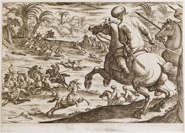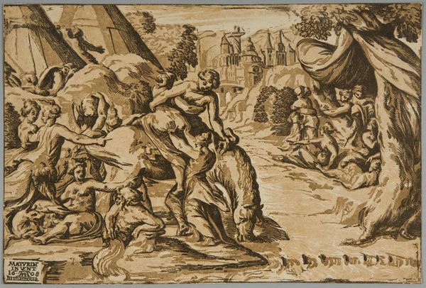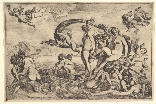 Editor: Here we have "Venus Upon the Sea", an anonymous print from the Harvard Art Museums. The scene is packed with figures, all rendered in incredible detail, and it feels like a celebration. What strikes you about this piece? Curator: It’s fascinating how anonymous works like this reveal so much about societal values. Who had access to these images, and what did Venus symbolize in that context? Was this a celebration of beauty, or a reinforcement of patriarchal ideals? Editor: That’s a great question. I hadn’t considered the power dynamics at play. Curator: Exactly! Examining the intended audience and the social function of the image opens up avenues for critical analysis beyond just aesthetics. What do you think? Editor: It makes me consider how classical mythology has been used and interpreted across different social contexts. Thanks for pointing that out! Curator: Of course! Art is never created in a vacuum, is it?