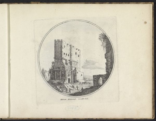 Curator: This etching is titled "Landschap met een ruïne", or "Landscape with a Ruin", made by Charles de Hooch sometime between 1610 and 1638. Editor: My immediate impression is one of melancholic beauty. The ruin stands as a poignant reminder of time's passage. It speaks of forgotten glory and nature's enduring power. Curator: Indeed. Landscape prints such as this, with their melancholic ruins, became popular with collectors, especially those on the Grand Tour seeking views of the past and reflections on the ephemeral nature of power. Editor: I am drawn to the visual symbolism here. The crumbling arches may represent decay and lost civilizations, while the figures could symbolize humanity's fleeting presence against the backdrop of history. Curator: Prints like these were definitely commodities, easily produced and widely disseminated. While de Hooch himself isn't especially well known, he clearly responded to a broader market for these kinds of images. The cultural impact comes not only from artistic innovation, but its capacity to appeal to a wider public interest in antiquity. Editor: I am fascinated by the artist’s technique, which renders details with such precision, but overall provides an amazing representation of the grand scale. Look at the vegetation crawling over the stones, a very baroque perspective! This emphasizes the enduring force of nature reclaiming what was once civilization’s grand edifice. Curator: Consider, also, the implications of circulating these kinds of images to patrons across different cities and principalities. In representing their view, they reinforced very specific perceptions about authority and permanence during periods of profound socio-political change. Editor: The symbols that touch me the most in baroque art are ruins: this represents cycles, from glory to disintegration, so it evokes themes that feel universally relevant even today. It asks questions about the meaning we ascribe to our endeavors. Curator: Exactly. I’ve never considered my cultural relativism like that before. Thank you for your refreshing insights. Editor: Thank you! I learned so much regarding these type of art commodities, and how imagery circulated during these ages.