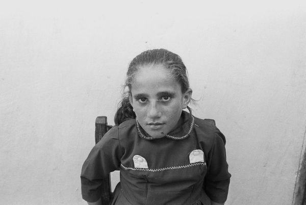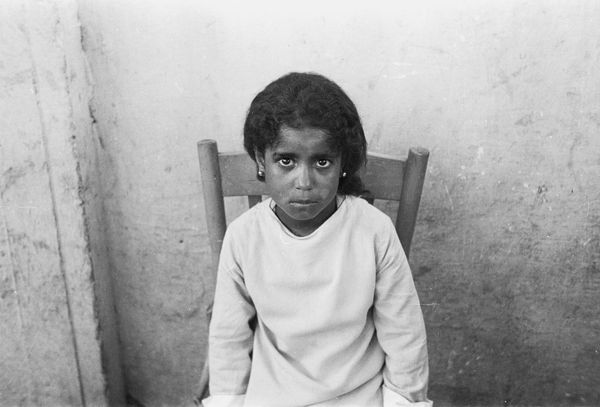 Curator: This arresting black and white photograph by Dorothea Lange, entitled "Mexican-American child, San Francisco," dates back to 1928. Editor: Immediately, her direct gaze is so captivating. There’s an openness and innocence, but also something quite sobering about those big eyes in black and white. It reminds me of portraits from the Depression era, a sense of vulnerability and resilience all at once. Curator: You're right to notice that connection. Lange's photography often sought to document the human condition, particularly marginalized communities. Here, even without explicit contextual clues, her visual language focuses our attention on the specific experience of a child, embedding this individual within a broader cultural history. It really foreshadows her later work during the Depression. Editor: And placing it in San Francisco, particularly 1928, adds a powerful layer. This was a time of increasing anti-immigrant sentiment. That straightforward gaze reads to me almost like a confrontation – an assertion of presence, identity, and belonging in a society that might seek to deny it. I see not just a child, but a young person staking a claim to her space and identity. Curator: Her expression transcends the immediacy of the photograph itself and speaks to something timeless: the enduring legacy of migration and the struggles for cultural identity, especially for children who often navigate complex cultural landscapes. Her clothing and that cloth—are they hand-me-downs? It seems they bear a coded symbolism reflecting economic realities and cultural pride. Editor: Absolutely. And the contrast between her denim shirt, and what looks like a carefully maintained white cloth across her chest—the bright whiteness draws attention and signals the importance of purity. That small detail can signal something very important, despite being mundane. Curator: It is like looking into a mirror reflecting both past struggles and future aspirations. In this intimate portrait, a dialogue across generations becomes possible, encouraging all viewers to remember. Editor: Yes, a child's gaze—simultaneously innocent and knowing—serving as a poignant reminder of the complexities of belonging and identity. The photograph’s beauty lies in the dignity it confers upon its young subject.