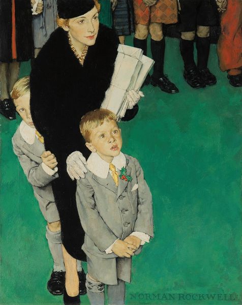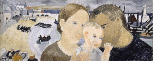 Curator: Standing before us is Philip Evergood's oil painting, "Happy Children," created in 1946. It is a fascinating piece from his body of figuration. Editor: Initially, the effect is unsettling. The facial expressions seem strained, almost mask-like, set against a rather turbulent backdrop. There’s an undeniable tension, despite the suggested cheer. Curator: Indeed. Evergood, deeply influenced by social realism, often imbued his work with underlying social commentary. Observe how the colour palette, while bright, possesses a certain dissonance; this unease is structurally woven into the painting's design through disjunction and deliberate distortion. Editor: You're right. The historical context is important. Consider that this was painted shortly after World War II. "Happy Children" might be seen not just as a genre painting of childhood innocence but as an expression of the anxieties still lingering after such a global conflict. The museum and the audience provide a location for the discussion of these topics, right? Curator: Precisely. The juxtaposition of subject and style here creates a compelling semantic field for potential meanings. He uses simplified forms and deliberate distortions to get to the very kernel of an idea. It feels more substantial than conventional naturalism. Editor: And, although labelled "Happy Children," do you read any evidence of state-sponsored or class discrimination at the time, or are these generalized portraits representative of some broader human emotion? Curator: The expressions are too enigmatic to give us anything definite. One may, of course, read almost anything into them with enough force of will. In any event, its semiotic play reveals greater subtleties, questioning the facile idea of ‘happiness’ so close on the heels of an unhappy war. Editor: The texture alone draws me back for multiple views. Curator: Agreed, an intriguing surface treatment certainly enlivens the image!