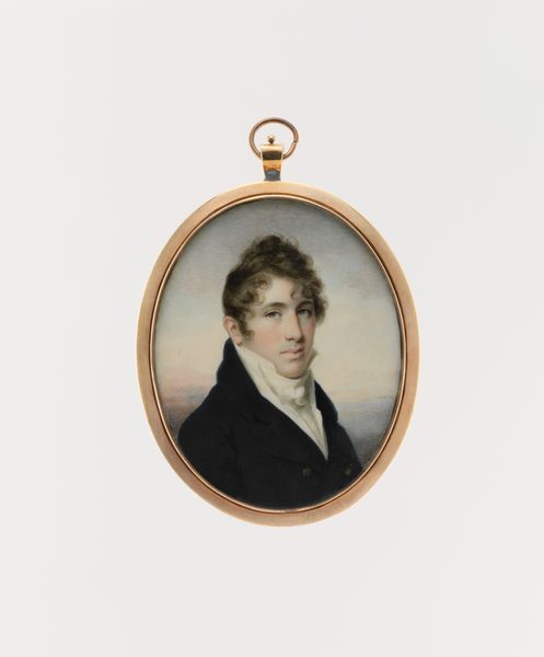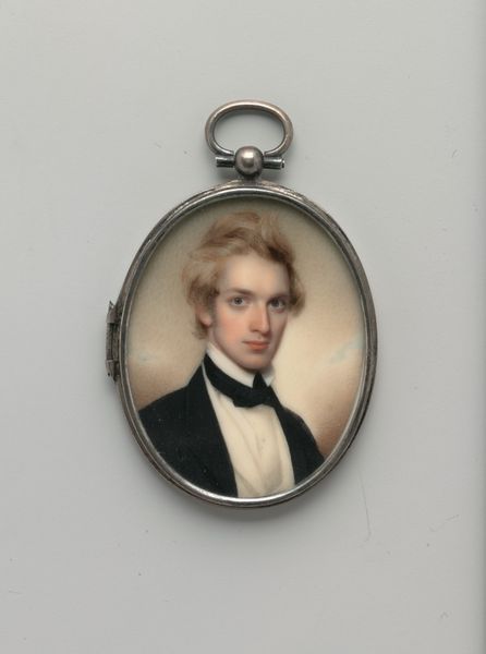Curator: A first impression is its miniature scale which imparts this peculiar intimacy, isn't it? Editor: Indeed. And here we have a jewel-like portrait miniature from sometime between 1749 and 1758. It’s simply titled "William Middleton". Curator: He is presented in the formal wear typical of his time—red jacket and black bow, ruffled undershirt, hair neatly styled—all signifiers of his social standing and youth during the period. It also speaks to enduring motifs of elite identity conveyed across generations through such commissioned portraiture. Editor: Right, and looking more closely at its materials, the thin washes of color reveal translucent layering which defines the subject's features; especially the way light and shadow subtly define his youthful countenance against an atmospheric background. The effect emphasizes surface quality versus depth illusion typical within Baroque aesthetics despite it falling into the orbit of Academic Art during that epoch. Curator: It’s designed as an intimate object. Its tiny size allows for carrying within a locket, keeping familial connections near, reflecting notions concerning memory but additionally as a tangible link to lineage, or inheritance possibly during times marked via high mortality rates among younger demographics...it represents life continuing its course irrespective amidst societal upheaval! Editor: The formal composition creates symmetry through restrained lines that lead inevitably up towards Middleton’s faintly smiling visage; his upward-directed regard creates openness—even optimistic possibility. Curator: Such commissions also bolstered artistic production demonstrating patron power to elevate status plus promote one’s reputation besides safeguarding memories against time’s passage via commissioning symbolic portraiture designed to transcend earthly lifetimes ultimately! Don't you concur? Editor: Absolutely. Studying “William Middleton" exposes interconnected ways through which social values from distant historical context manifest utilizing structural properties like dimension, texture alongside chromatic schemes! Curator: By viewing how past customs resonate within current art historical perspectives we enrich our comprehension and connection with diverse shared legacies! Editor: And appreciating "William Middleton," even at such modest scale, invites greater considerations about portraiture both past—and perhaps future applications—don’t you feel?!